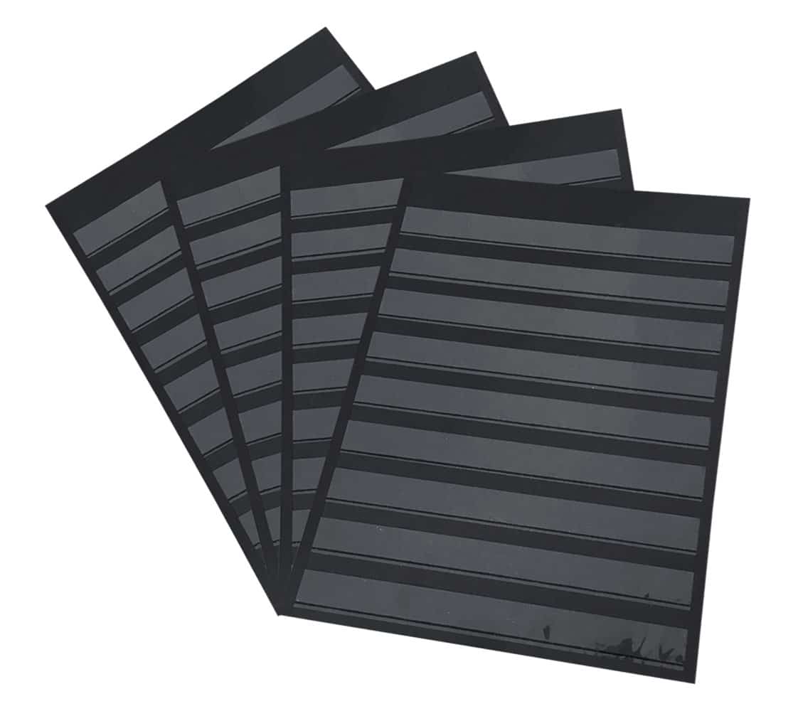 Kraftig sort karton med foliestriber på begge sider.